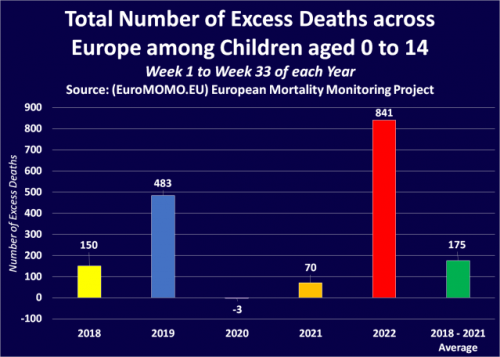 Na žalost se ta trend nadaljuje v letu 2022, saj je Evropa doslej uradno zabeležila 381-% povečanje presežnih smrti med otroki v tem letu v primerjavi s povprečjem med letom 2018 in 2021.
