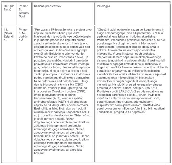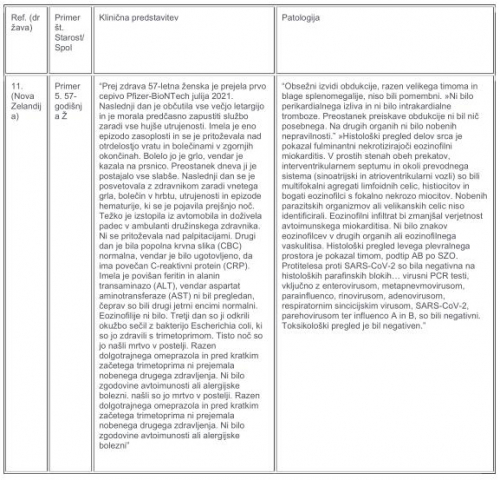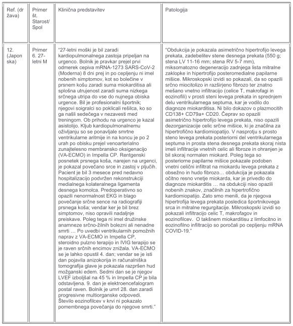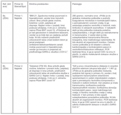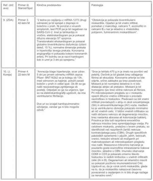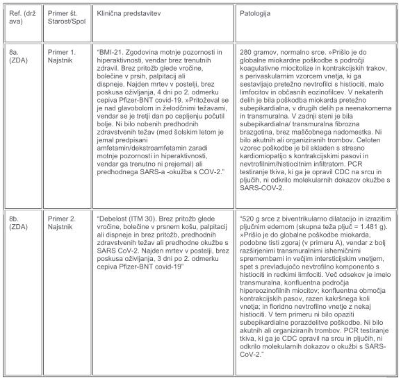 V tabelah 1–3 so podrobno opisani objavljeni izsledki obdukcije šestih smrtnih primerov miokarditisa, povezanih z mRNA cepivom proti kovidu. Etiologije za primera 1 in 2 so bile najbolj skladne s “toksičnim miokarditisom”, ki ga povzroča epinefrin, medtem ko so primeri 3-6 kazali na hipervnetni miokarditis. Na koncu so po obsežni preiskavi vsak primer označili za smrtonosni miokarditis, ki ga je povzročilo cepivo proti kovidu.