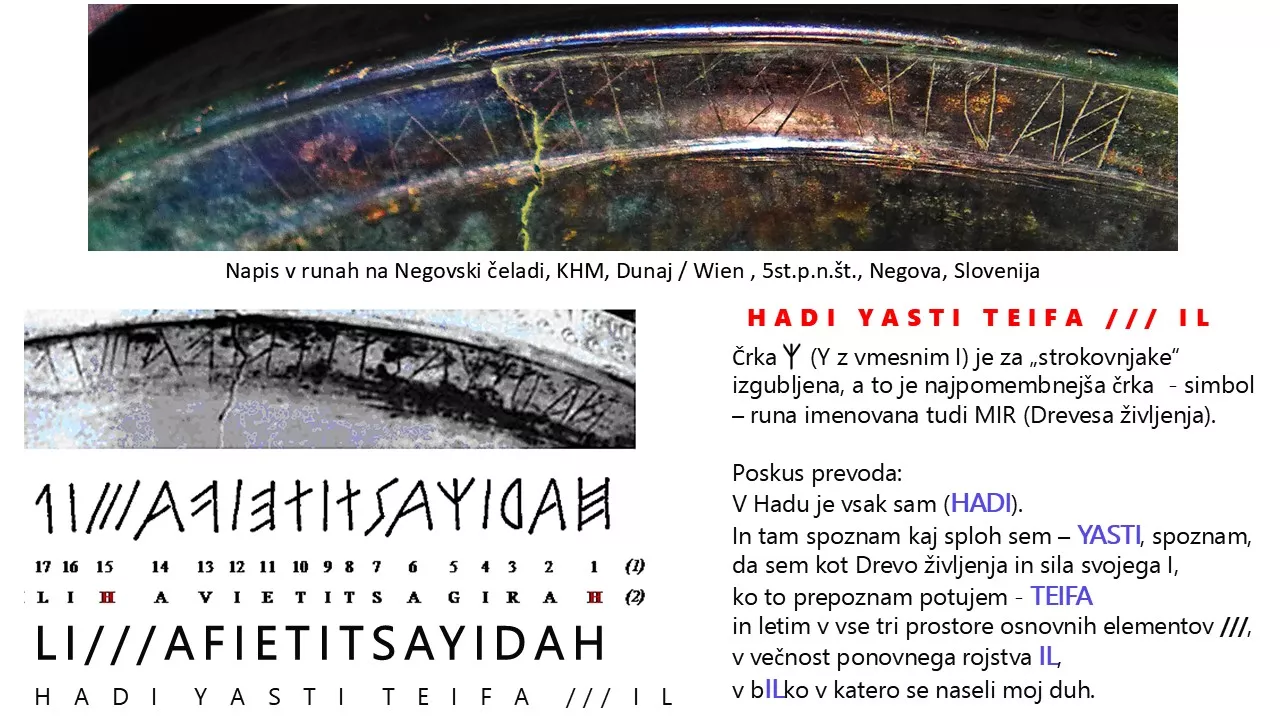 Oglejmo si napis na Negovski čeladi iz 5st.p.n.št. najdena je bila v Negovi v Sloveniji, seveda v narodnem muzeju ne premorejo niti kvalitetne kopije slovenske najdbe izjemne zgodovinske dragocenosti, hrani jo Zgodovinsko znanstveni muzej na Dunaju (KHM Wien). Napis govori o svečeniškem statusu vodje starodavnih knezov, črke so RUNE, ki je skrivni svečeniški jezik vezan na raziskovanje sveta kot energije. Ta jezik je zato razumsko neulovljiv, saj je vezan na vizije in magijo UMa. O tem več kdaj drugič.