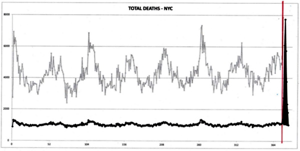 The all-cause mortality data for certain areas, NYC in particular, also exhibited a highly anomalous “COVID peak”, certainly not explainable in terms of a novel respiratory pathogen.