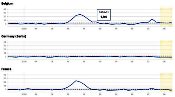 “Z-score for various European countries, Dec. 2019 – Sept. 2020”But it’s not only this anomalous “COVID peak” (which occurred outside the regular flu season), they also note the fact that neighbouring countries often exhibited a completely different pattern of excess mortality. For example, Belgium had a rather noticeably peak while Germany (its neighbour), did not.