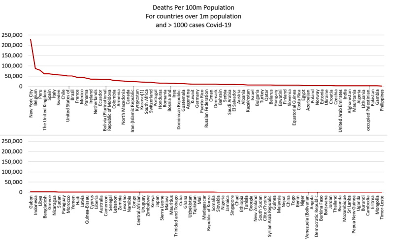 The graph shows the number of recorded COVID deaths in different countries, normalised to account for the difference in population sizes. Once again, the data is highly anomalous. New York City has by far the highest COVID death rate, higher than any other country in the world at that time! Belgium, Peru, the UK and Spain are also high on the list, while African countries, South East Asia and Japan barely feature.