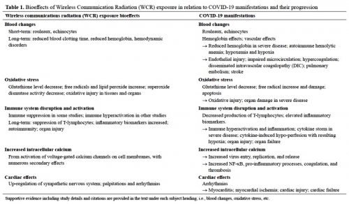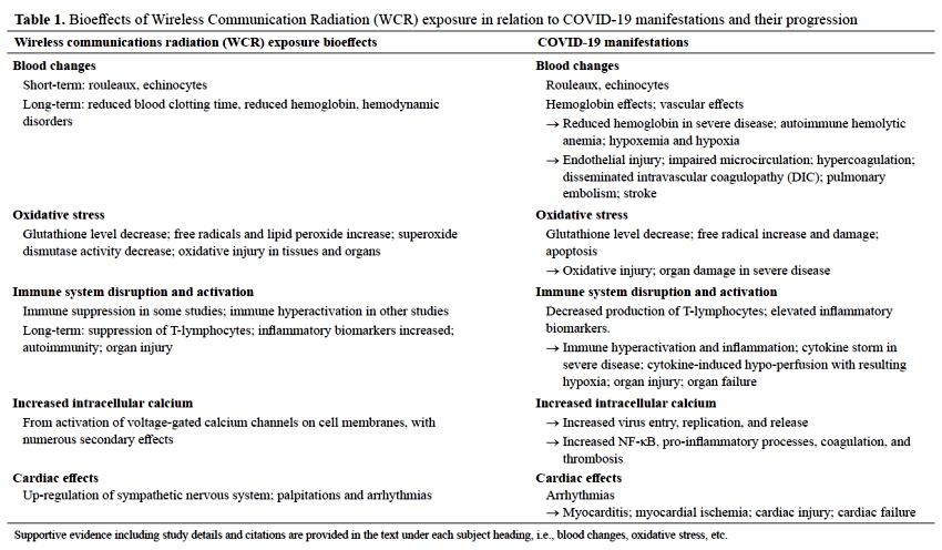 “There is a large body of peer reviewed literature, since before World War II, on the biological effects of WCR [wireless communications radiation] that impact many aspects of our health. In examining this literature, we found intersections between the pathophysiology of SARS-CoV-2 and detrimental bioeffects of WCR exposure. Here, we present the evidence suggesting that WCR has been a possible contributing factor exacerbating COVID-19.”