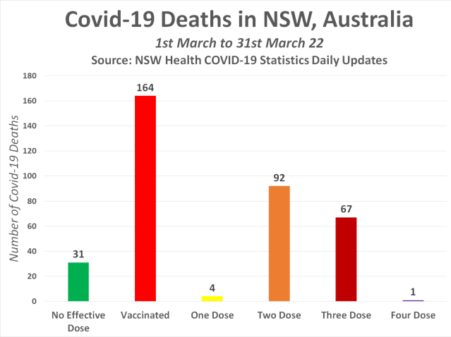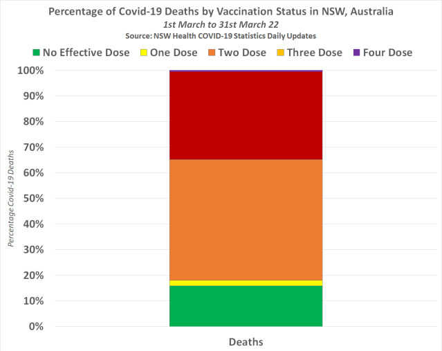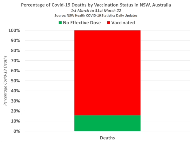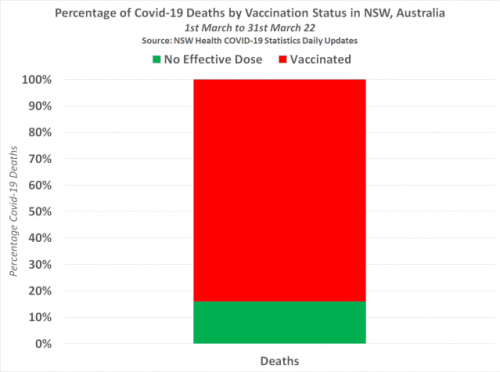 In all the no-effective-dose population accounted for 15.8% of all Covid-19 deaths between 1st and 31st March; whilst the vaccinated population accounted for 84.2%, meaning over 4 in every 5 Covid-19 deaths in NSW, Australia are now among the vaccinated population.