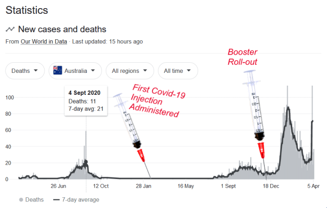 Who can deny that as fact with so many people in Australia succumbing to the pressure and coercion to get vaccinated, and the 7 day average number of Covid-19 deaths currently being 18 times higher than they were two years ago at the beginning of the pandemic?