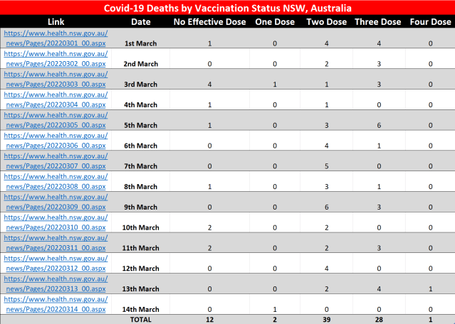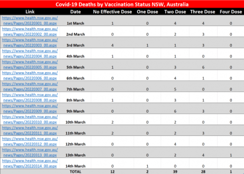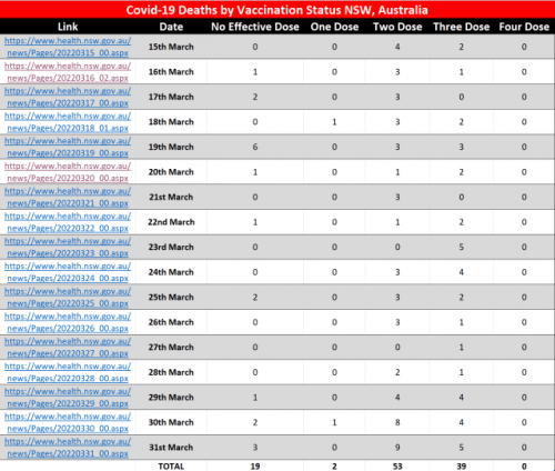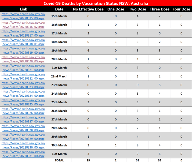 However, the Government of New South Wales has been revealing the number of deaths by vaccination status in a new daily ‘Covid-19 Statistics’ update, the full list of which can be found here. We’ve also provided links to the 31 reports for the entirety of March 2022 at the end of this article.