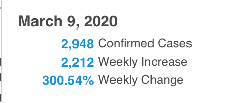 In the US on 9 March 2020, there were 3,457 “confirmed cases” out of a population of 329.5 million people.