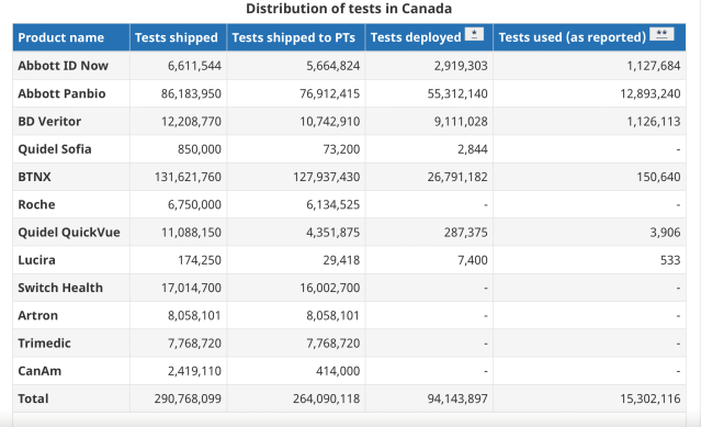 Canada has a population of 38.5 million and we now have 291 million antigen rapid test kits (see table below). In other words, exactly 7 tests per person.