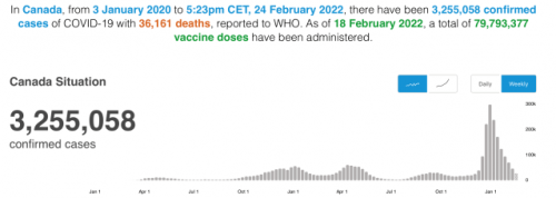 Screenshot of WHO graph Interactive WHO graphIn Canada on 9 March 2020, there were 125 “confirmed cases” out of a population of 38.5 million people.