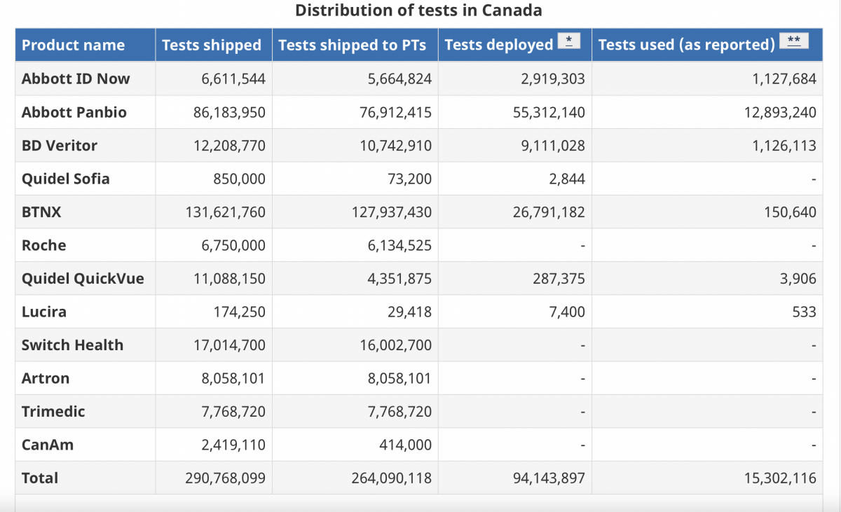 Canada has a population of 38.5 million and we now have 291 million antigen rapid test kits (See table below). In other words exactly 7 tests per person.
