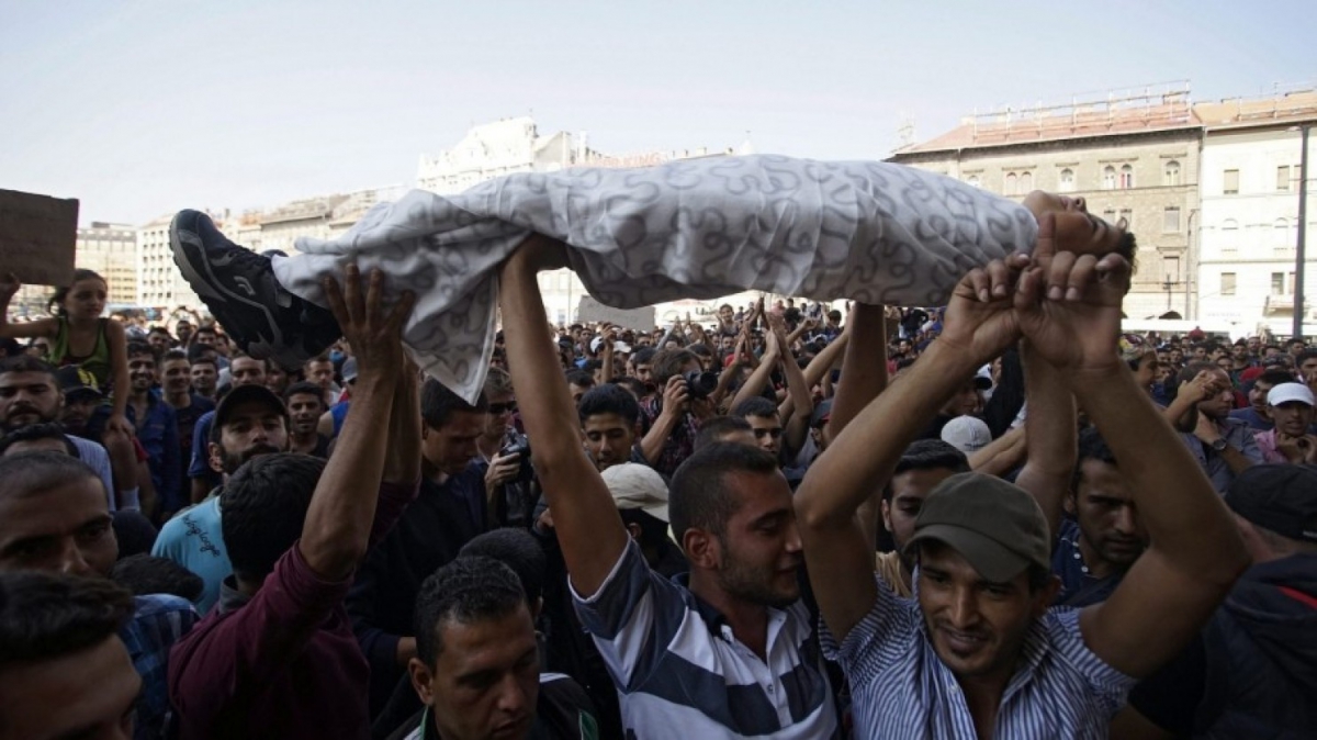 Migrants hold up a migrant man as a sign of protest against the closure of Keleti Railway Station in Budapest on Sept. 2. (Zoltan Balogh/European Pressphoto