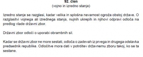 Izredno stanje se razglasi, kadar velika in splošna nevarnost ogroža obstoj države. O razglasitvi vojnega stanja, nujnih ukrepih in njihovi odpravi odloča na predlog vlade državni zbor.