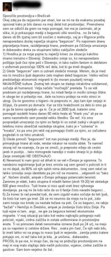 2) Glede "beguncev" sem si ustvaril sledeče mnenje. Menim, da je med vso to množico ljudi dejansko zelo majhen delež beguncev. Veliko večino predstavljajo ekonomski migranti ki (to moram poudarit) nimajo NIKAKRŠNE kulture. Znotraj teh skupin ne vladajo nikakršna solidarnost, sočutje ali humanost. Velja načelo "močnejši" prevlada. To se vidi predvsem pri razdeljevanju hrane, ko mladi fantje in moški izrinejo šibke in uboge ter si prilastijo vse...šele na koncu pridejo na vrsto otroci in ubogi. Da ne govorimo o higieni---te preprosto ni. Jejo tam kjer serjejo in ščijejo, če povem po domače. Kar se tiče hvaležnosti za delo ki smo ga in ga še bomo opravljali---ga ni. Če je od 2000 ljudi, katerim smo pomagali razdeliti hrano danes 50 reklo hvala ali "thank you" ali pa se samo nasmehnilo sem povedal veliko številko. Še več. Ko smo pospravljali umazanijo za njimi so fantje ki so ostali zadnji v skupini po telefonu mirno obveščali naslednje skupine, kako je v "slovenia" in "kroatia", ko pa smo jim rekli naj pomagajo čistiti za njimi, so začudeno pogledali in se hitro umaknili.