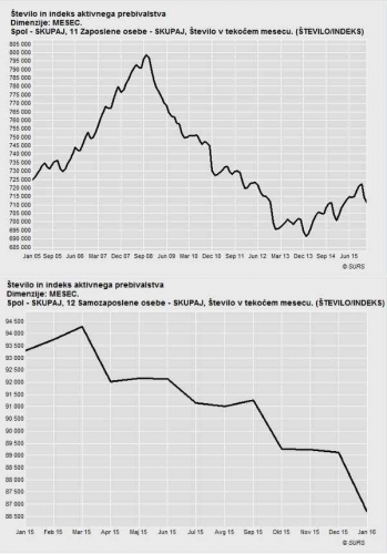 Zaposlenost stoji na mestu v okolici najnižje točke (zakaj bi kam šla, kaj smo pa storili za to?); inšpektorji in davčne blagajne pa počasi uničujejo samozaposlene.