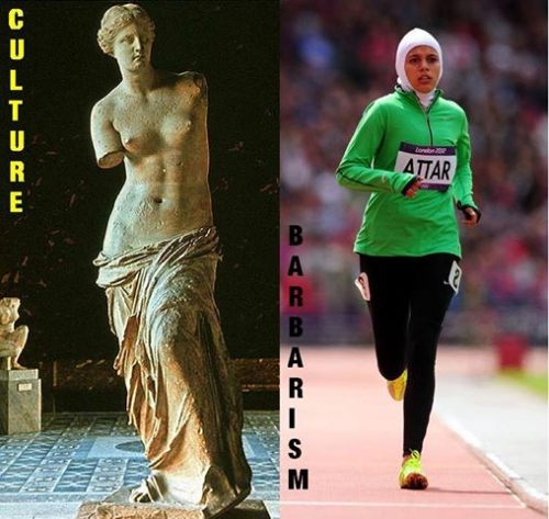 Doživeli smo demonstracijo islamskega barbarstva, ki se sramuje človeškega telesa, in ki predsodke ter ideologijo postavlja pred vrednote na katerih slonijo principi olimpijskih iger. islam politiko in ideologijo vsiljuje športu in zlorablja manifestacijo človeške lepote in moči človeštva za vsiljevanje svojih barbarskih prepričanj.