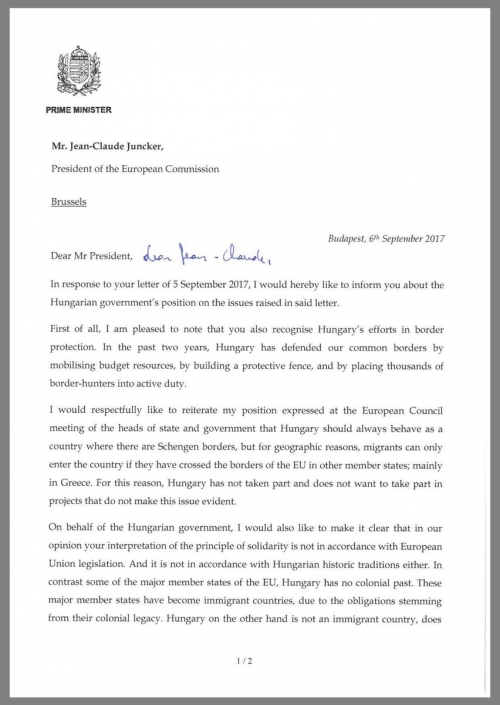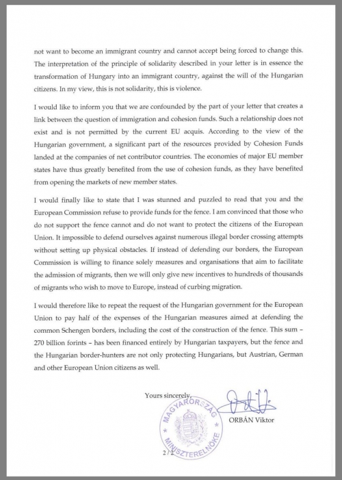 V imenu madžarske vlade želimo tudi pojasniti, da po našem mnenju vaša interpretacija »principa solidarnosti« ni v skladu z zakonodajo Evropske zveze. In ravno tako ni v skladu z madžarsko zgodovinsko tradicijo. Za razliko od nekaterih drugih držav članic, Madžarska nima kolonialne preteklosti. Te države članice so zaradi obvez, ki izhajajo iz njihove kolonialne dediščine postale imigrantske države. Madžarska, po drugi strani NI imigrantska država, NE ŽELI postati imigrantska država in NE MORE DOVOLITI, da je to prisiljena postati. Interpretacija principa solidarnosti, ki ste jo opisali v pismu nujno pomeni transformacijo Madžarske v imigrantsko državo – proti volji Madžarov. Po mojem mnenju to ni solidarnost – to je nasilje.