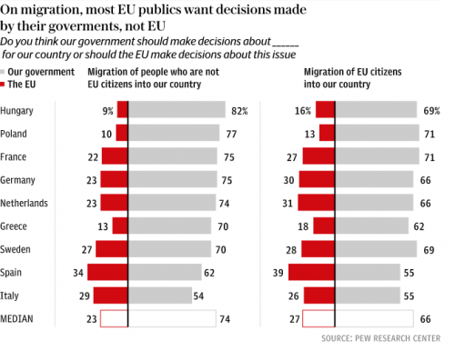 Da gre v primeru vsiljenih migrantskih kvot, ki jih pri nas podpirata tako levica, kot desnica v resnici za dobesedno posilstvo evropske demokracije s strani globalističnih elit je jasno tudi po rezultatih raziskave, narejenih s strani PewResearch centra. Niti v eni od izbranih zahodno in srednjeevropskih držav (Nemčija, Italija, Francija, Poljska, Nizozemska, Grčija, Švedska, Španija, Italija) se ljudje večinsko NE STRINJAJO s tem, da bi o migrantski politiki odločal Bruselj. Tako povprečno zgolj 23% evropskih volivcev podpira idejo, da naj migrantsko politiko vodi Bruselj, kar 74% pa tej ideji nasprotuje. Niti Bruslja, niti evropskega sodišča za človekove pravice torej popolnoma nič ne gane, da Evropejci z več kot dvotretjinsko (ustavno) večino nasprotujemo vtikanju in odločanju Bruslja glede imigrantske politike nacionalnih držav.