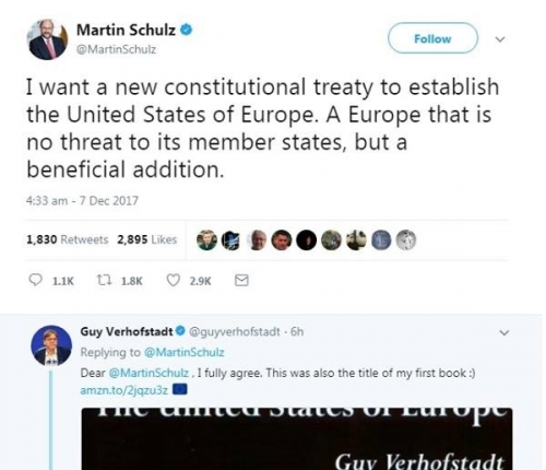 Martin Schulz, nekdanji predsednik evropskega parlamenta ter predsednik evropskih social demokratov in Guy Verhofstadt voditelj evropskih liberalcev (ki je sicer najbolj fanatični podpornik te ideje) sta po Twitterju javno pozvala da zahtevata oblikovanje ZDE v 8 letih. Schulz je to izjavil kot enega od pogojev za koalicijsko sodelovanje z Merklovo,  k temu pa ga je po telefonu spodbudil francoski liberalec in globalist Macron. Elita, v katero lahko štejemo vladajoče leve in desne stranke Zahodne Evrope in njihove voditelje (Schulz, Juncker, Merklova, Verhofstadt, Macron, May, …) torej ne bo dopustila, da jo na oblasti kdorkoli zamenja (četudi na volitvah izgublja tla pod nogami) ampak bo šla do konca in si poskušala zagotoviti prihodnost preko vladavine iz Bruslja. Združene države Evrope pomenijo, da se bomo morale države članice odpovedati svoji narodni samostojnosti in neodvisnosti ter priznati vrhovno oblast Bruslja. Gre torej za neke vrste "prostovoljno" okupacijo lastne države s strani tuje sile – v našem primeru Združenih držav Evrope. Po najnovejših raziskavah naj bi celo v Nemčiji Združenim državam Evrope nasprotovalo 60% ljudi, kar 32% pa naj bi to idejo podpiralo. Mnenje javnosti v takih primerih navadno sicer čedalje manj šteje. Seveda pri domačih politikih, ki bi to podprli ne gre le za narodno in državno izdajo, temveč tudi za izdajo ustavnih temeljev, na katerih stoji republika Slovenija kot suverena in neodvisna država. Politiki, ki takšne stvari podpirajo bi za to morali odgovarjati pred sodiščem (in verjetno v določenem času tudi bodo).