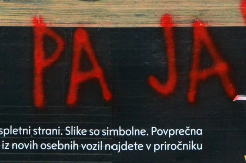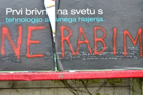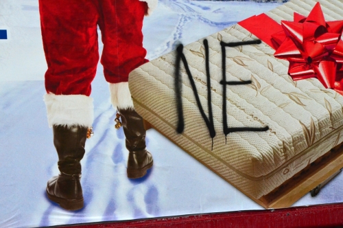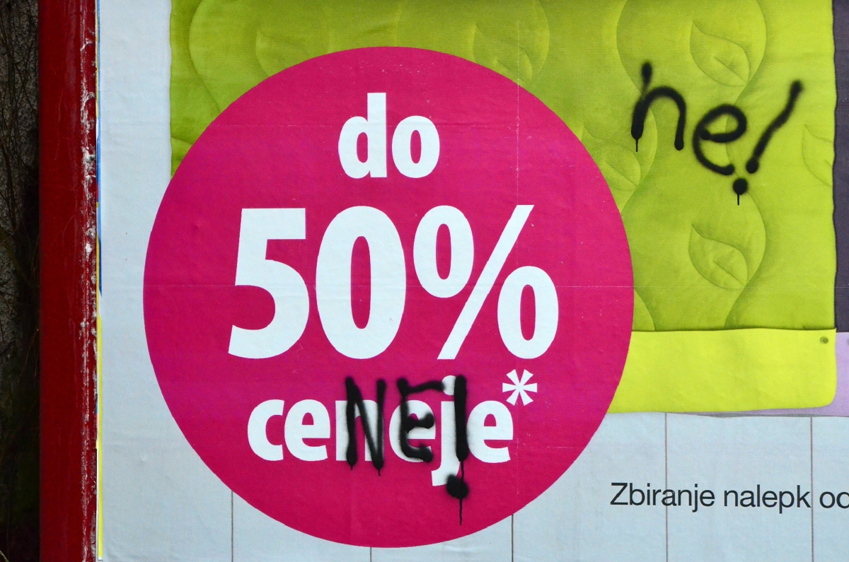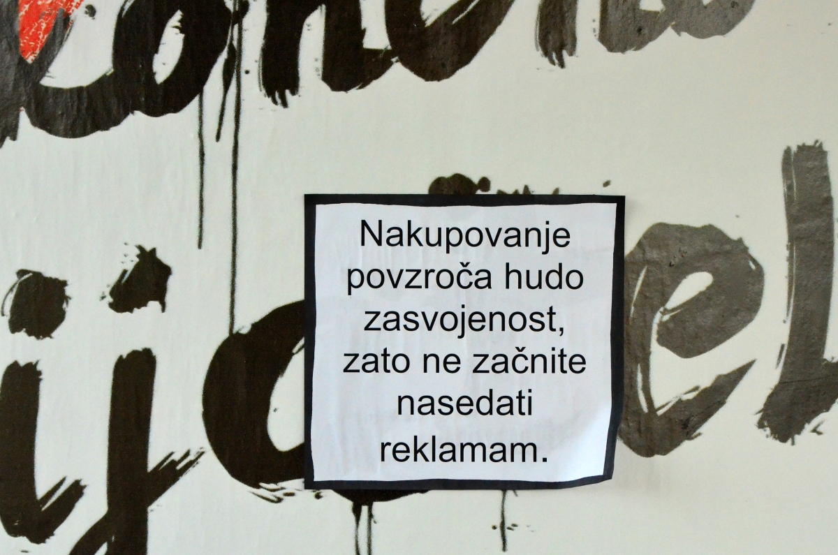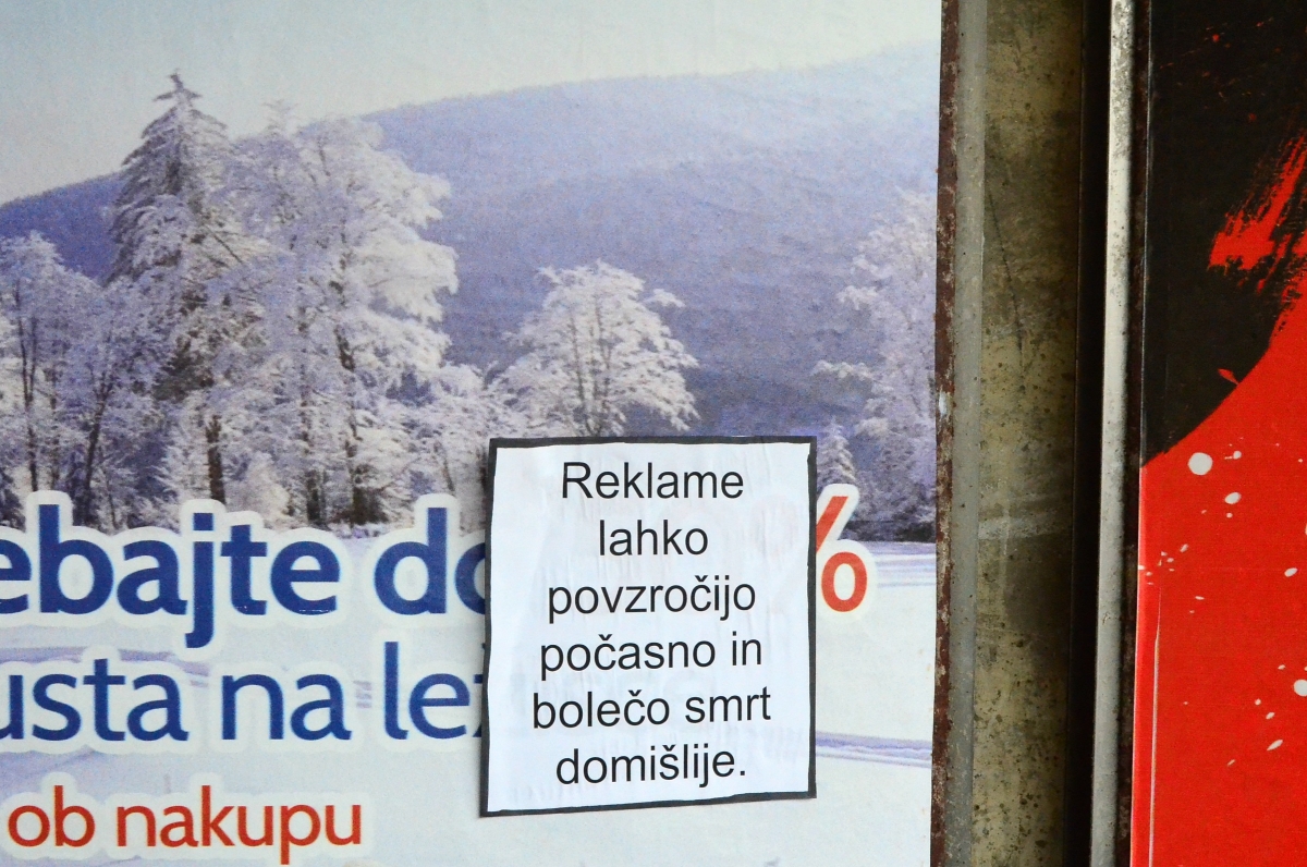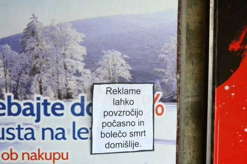 Nekdo (morda skupina?) se je na našem koncu lotil gverilske akcije proti reklamam in potrošništvu. Saj vem, da ne bo uspelo premakniti celotnega kolesja, pa vendar mi je všeč trud in smer, četudi se sam ne bi takole loteval. Ni moj način. Verjamem pa v majhne korake in premike na osebnem nivoju. In tale je to dosegel. Morda pa se kdo zamisli …