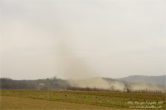 Ko sem konec februarja hodil ob reki Vipavi, sem videl podobne prizore. »Pokrajina je na debelo prekrita z drobnim prahom. Nekatere njive so zasute z uprašeno prstjo, iz katere štrlijo samo konice žitnih bilk. Druge njive so ogoljene do kamninske podlage in kažejo videz polpuščave. Silni sunki burje so odpihnili tisto, kar je bila nekoč rodovitna prst. Humusa ni več, in ko zajamem zemljo v dlan, mi steče med prsti kot pesek v peščeni uri. Ko zapuščam nesrečno Vipavsko dolino, se ozrem in vidim, da nad pokrajino lebdi orjaški prašni oblak. Kot zlovešča rdeča goba je, skozi katero prenika le medla sončna svetloba.«