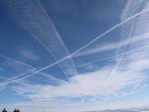 ... no in zunaj opažajo, da so ta letala BREZ OZNAK, ki pršijo, da so ta letala v glavnem tipa Boeing 707 in da so ti vzorci dosti geometrično pravilni, torej nekako z intenco, da se pokriva ta zračni prostor. Tudi opaženo je, da so civilna letala preusmerjena stran od teh področij, torej dobijo nov koridor, začasno, ko se to prši. To so opažanja zunaj. Druga stvar je pa, da se že na nebu loči med chemtrailsi, torej kemičnimi sledovi in takoimenovanim contraili, kondenzacijskimi sledovi, ki so normalni. Contrails izgine nekako po petih do dvajsetih sekundah, to so večdesetletne izkušnje, chemtrailsi pa vztrajajo ure in ure na nebu, in se počasi širijo.
