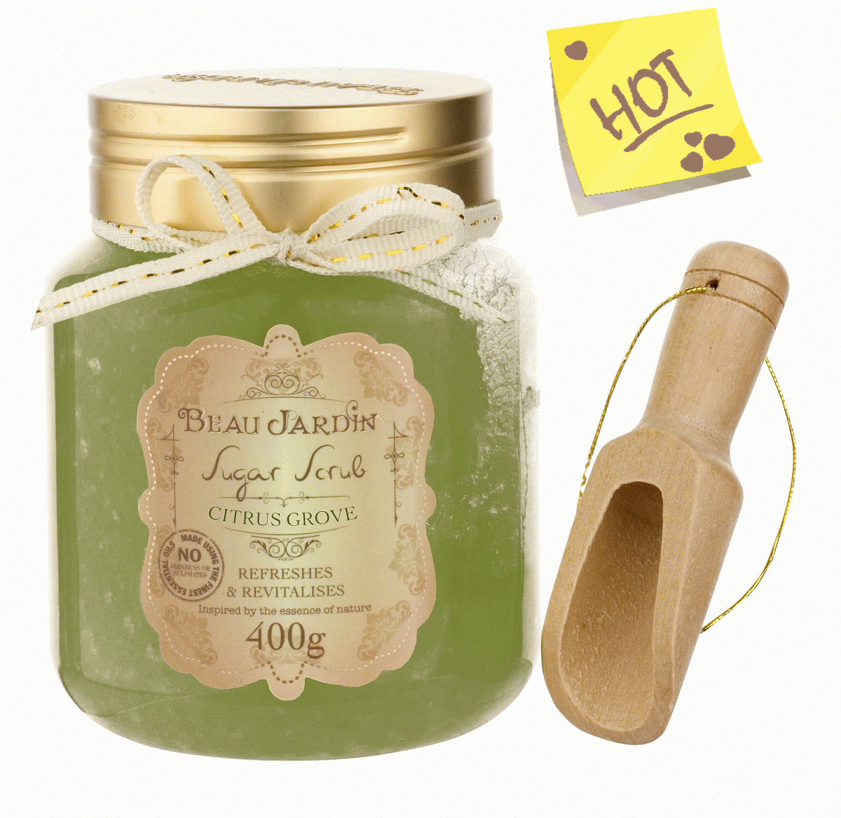 BJ - Sladkorni peeling Citrus grove, kožo prijetno omehča in odstrani odmrle celice ter jo pusti prijetno odišavljeno po citrusih, mmm opojno!