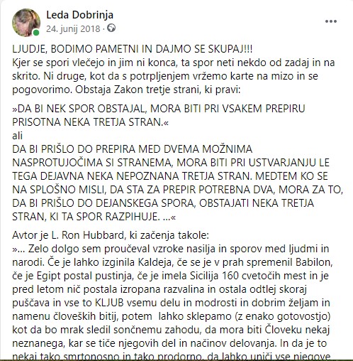 Te dni je bil na spletnem omrežju sprožen napad name in Jirija Kočico kot na prebarvana vrinjenca, zasoljenega z insinuacijami in osebnim klevetanjem. Napadanje s strani B. B. se je začelo pred poltretjim letom ob moji objavi citatov filozofa in humanista L. R. Hubbarda, katerega učenju in delu sem posvetila dober del svojega življenja. Šlo je za citat v zvezi z razklanostjo našega naroda, z vedno novimi razkoli v politiki in med državljani ter njihovimi pobudami. Tedaj sem objavila krajši izsek iz spisa na to temo in isto ponovila še ob sporu v vodstvu Domovinske lige ter v svoji knjigi Tretja istrska prebuja in njene senčine. Razklanost je ključna točka, ki jo moramo preseči za ohranitev našega obstoja.