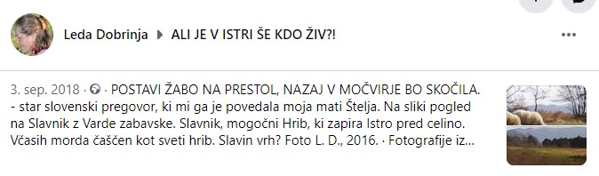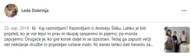 Zgoraj kratka objava s slovenskim pregovorom na fb skupine Ali je v Istri še kdo živ?!, ki je bil povod za žaljive komentarje B. B. na račun nekdanjega prijatelja in še objava z mislijo na Andreja Šiška, ki se je tedaj nahajal v zaporu.