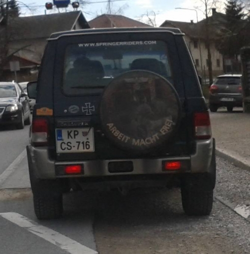 Poglejte si to sliko? Na rezervnem kolesu bi naj bile upodobljene peči, kjer so zažigali nedolžne žrtve. Kljukasti križ je levo od rezervnega kolesa.