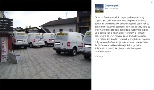 Očitno državni ekstradniki Hojsa podpirajo in imajo dogovorjeno, da male siromake izčrpava. Kaki Šrot, Bavčar in take ne bo, ker od takih nebi nič dobil, ker so z plačanimi odvetniki zaščiteni. Tu na sli se vidi, kako bo letos na veliko Hojs delal in njegova (udbovska ekipa). Si je omislil kar 5 novih avtov. TAKO DA Z HOJSOM DOL. Ljudje za kruh nimajo, in še jim hodi na vrata. Hojs ni tako kot je eden rubežnik v drugi državi poplačal dolgove ene družine, ko je videl v kakem stanju živijo. Se bi še moral kakšen taki najti, kakor je tisti v Poljčanah bil pred 2 leti, ko je malo šrota proti rubežniku spustil.