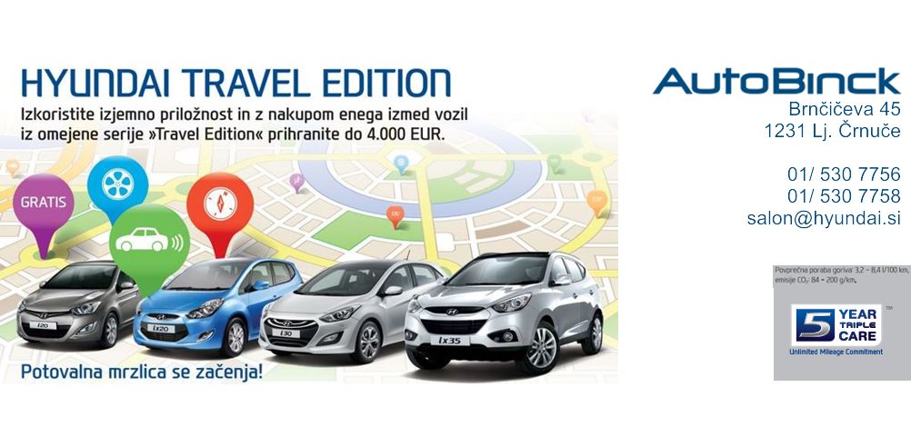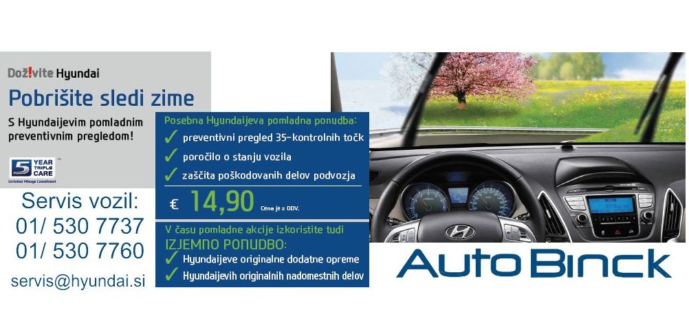 AUTOBINCK, Ljubljana Brnčičeva 45, Ljubljana - Črnuče 01 530 77 60 (servis), 01 530 77 56 01 530 77 58 Telefax 01 530 77 55 E-pošta info@hyundai.si , servis@hyundai.si salon@hyundai.si http://www.autobinck-ljubljana.si/