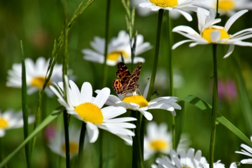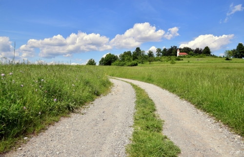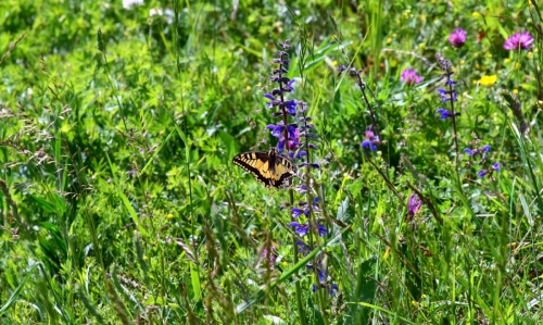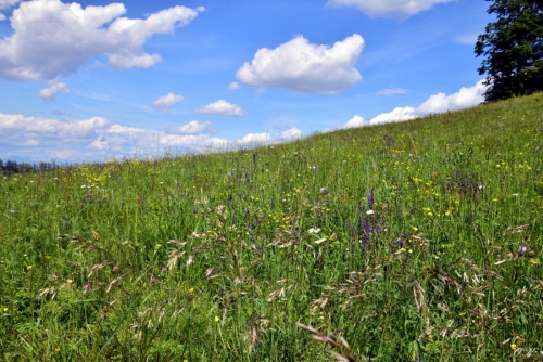 Mimo cvetočih, nepokošenih travnikov, po poljski poti na vrh.