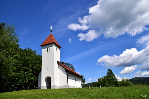 Tokratni sprehod se je začel pod cerkvico sv. Lovrenc, ki čemi na rahli vzpetini nad vasjo Jezero.