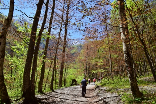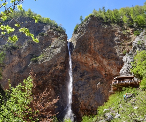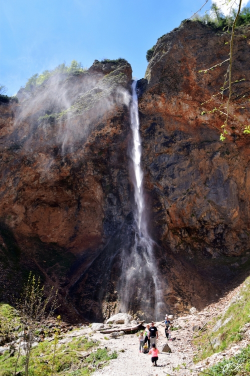Pogled na hribe je očarljiv in po še kar dobri poti se podava do slapa Rinka.