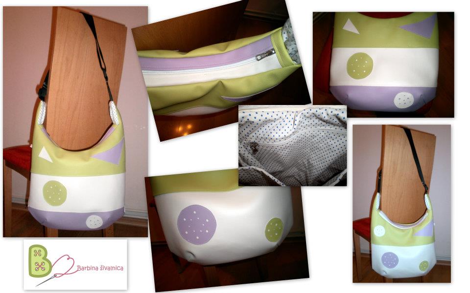 torbica iz skaja ... zelena, bež, vijola .. nastavljiva naramnica .. 3 notranji žepi (eden na zadrgo) .. trakec za ključe Velikost:40x30 cm