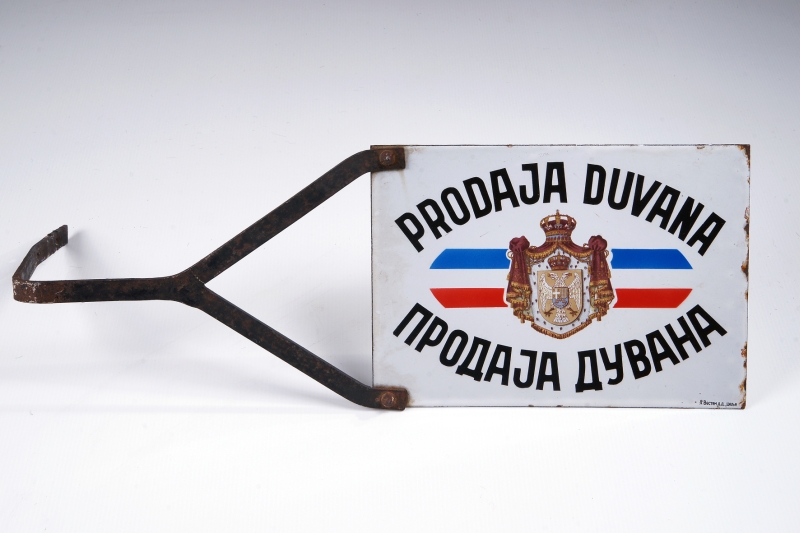 Prodaja tobaka in cigaret je bila vedno državni monopol. Le-te so prodajali v trgovinah, označenih s posebnimi napisnimi tablami. Za Kraljevino Jugoslavijo so jih izdelovali v tvrdki (podjetju) A. Western, d.d. v Celju. Napis »PRODAJA TOBAKA« je bil v latinici in cirilici na obeh straneh. Napisna tabla je iz emajliranje pločevine, pritrjene na železen nosilec.