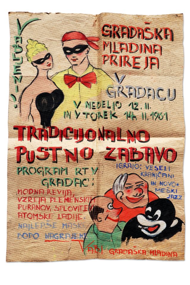 Pustovanja so prirejali v vseh večjih krajih v Beli krajini. V Gradcu je pustovanje leta 1961 pripravila "gradaška mladina". Društvo se je kasneje poimenovalo Gradaški mački. Plakat za prireditev je izdelal domači mizar Jože Jakša.