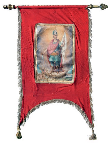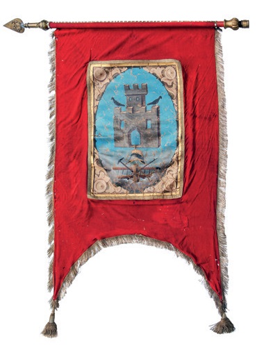 Društveno zastavo iz rdečega blaga in okrašeno z zlatimi resicami krasi na eni strani podoba sv. Florjana, zavetnika gasilcev, na drugi pa metliški mestni grb z gasilskimi znaki. Razvitju prapora je 23. maja 1875 "kumovala" graščakova žena Karolina pl. Savinškova, ob tej priložnosti pa je bila v Mestnem logu velika ljudska veselica, ki so se je udeležili tudi gostje iz Karlovca.