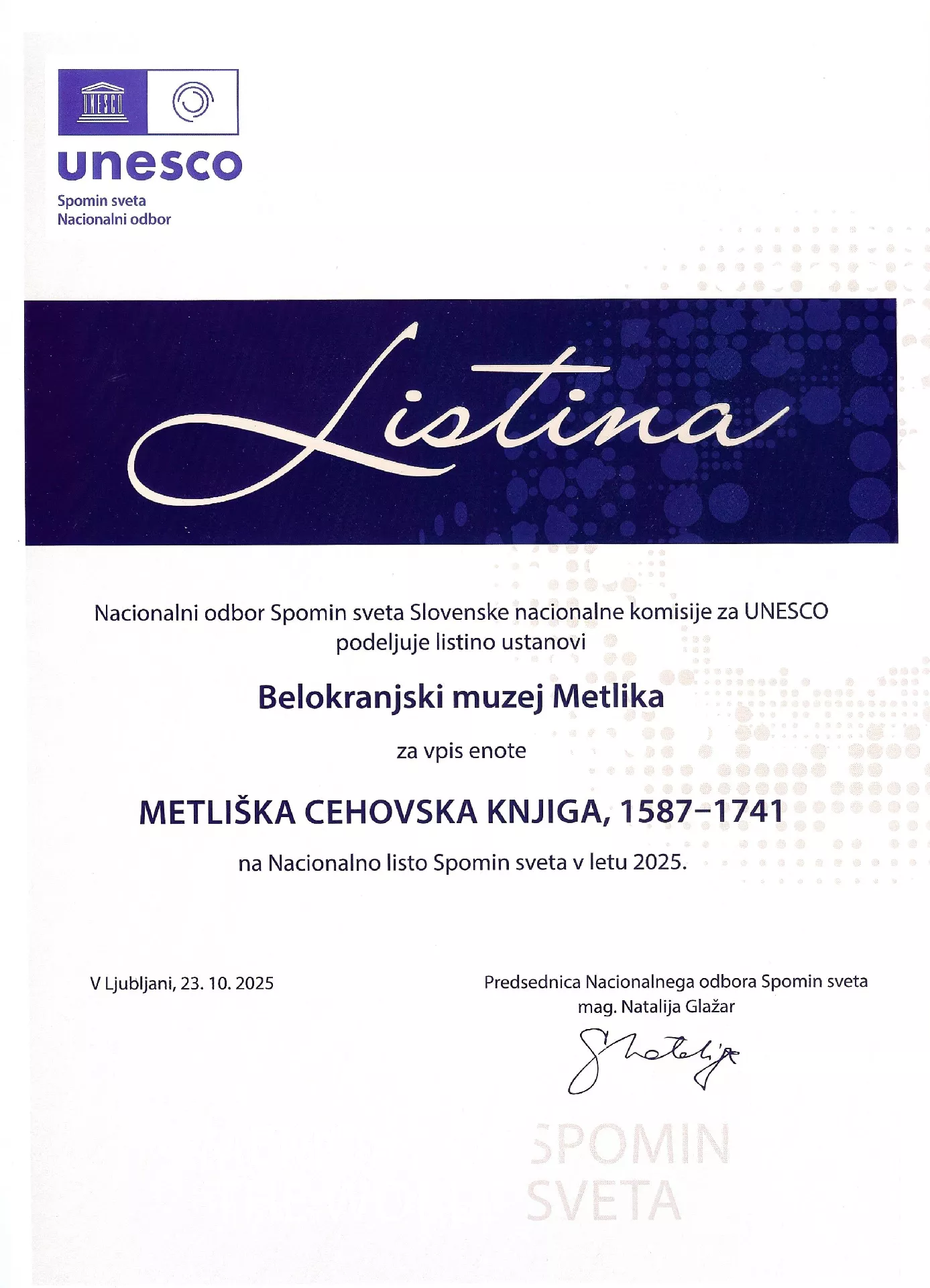 23. 10. 2025 je bila v Narodnem muzeju Slovenije podelitev listin UNESCO Spomin sveta. Slednjo je prejela tudi Metliška cehovska knjiga s prvimi zapisi uradovalne slovenščine iz 16. stoletja. K objavi prilagamo obraložitev prijave.