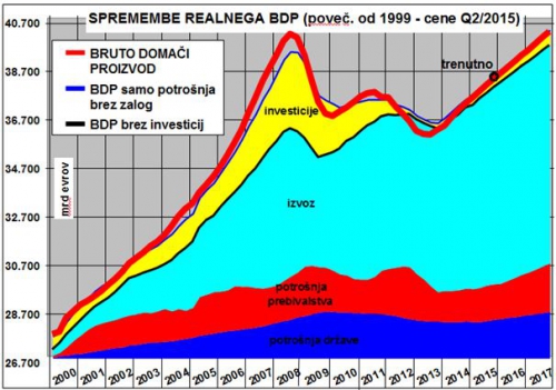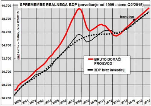 Na spodnji sliki je prikazano gibanje realnega BDP Slovenije od leta 1999 vse do 2017 na osnovi predvidevanja oz. nadaljevanja dosedanje rasti. Odebeljena rdeča črta kaže realni BDP po trenutnih cenah in lepo je vidna hitra rast do leta 2008, nato dvojni padec ter ponovno rast od sredine leta 2013. Ob pričakovanem nadaljevanju gospodarske rasti z okoli 2,5 % na leto, bomo proti koncu leta 2017 dosegli že nekdaj videnih 40 milijard evrov bruto domačega proizvoda. Pri tem je obseg BDP preračunan v cene drugega letošnjega drugega kvartala, tako da so podatki primerljivi. Dodam naj še pojasnilo, da gre sicer za letne podatke vendar izračunane vsake tri mesece kot seštevek zadnjih štirih kvartalov. In iz tega gibanja seveda ne moremo narediti drugačnega zaključka kot da bomo leta 2017 ponovno dosegli obseg BDP iz leta 2008 in da smo nekako izgubili zadnjih deset let rasti.