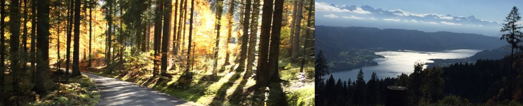 V deževnih dneh je kolesarjenje med obarvanim drevje svojevrsten užitek. Zrak je sicer že precej hladen in večina kolesarjev je kolo že »konzervirala« za naslednjo sezono. A ob lepem vremenu je vožnja lahko vseeno prijetna, seveda ob ustrezni opremi in oblačilih. Zgornji posnetek bi bil pravzaprav lahko od koderkoli, a narejen je bil v hribih nad Osojskim jezerom, pod Osojščico (Gerlitzen). Gozdne ceste nas pripeljejo dokaj visoko in za razliko od Karavank, tukaj kolesarjenje celo ni prepovedano (večina gozdnih cest na severni strani Karavank ima namreč prepoved kolesarjenja, ker so gozdovi privatni – k sreči, pri nas tega, vsaj za zdaj, še ni). Med potjo se nam potem sem ter tja odpre pogled tudi na Osojsko jezero.