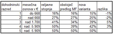Obstoječi predlog Ministrstva je sicer znižal višino obdavčitve v srednjih dohodninskih razredih, vendar so spregledali, da so po teh stopnjah obdavčeni tudi prejemniki najvišjih plač. Tudi nekdo z 10.000 evri mesečne plače ima prvih 700 evrov obdavčenih samo s 16 % dohodnine, naslednjih 1.000 evrov po 27 % in tako naprej do 50 % stopnje za prihodke nad 6.000 evrov. Če torej hočemo razbremeniti srednji sloj, je potrebno znižati najnižje stopnje, srednje pa celo zvišati. Na spodnji tabeli je prikazana lestvica dohodninskih stopenj za posamezne razrede in sicer obstoječa lestvica, predlog Ministrstva od 12.7. ter ena izmed možnih variant, ki bi dala zgornje, mogoče nekaj bolj sprejemljive rezultate.