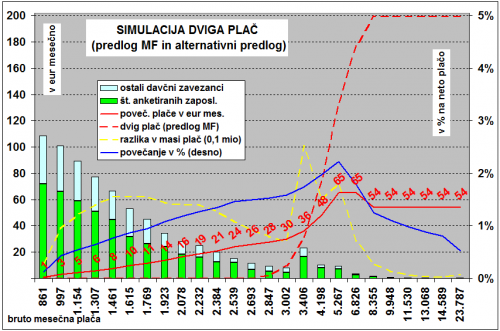 Na spodnji sliki je tako prikazana ena od opcij po kateri bi učinke davčne razbremenitve razporedili po celotni lestvici plač. S prekinjeno rdečo črto so prikazani učinki po obstoječem predlogu Ministrstva od 12. julija (torej šele za prejemnike bruto plač nad 3.000 evrov bruto mesečno). S polno rdečo črto (in konkretnimi zneski) pa je prikazana ena izmed rešitev po katerih bi najvišje plače porasle za 55 evrov mesečno, ostale pa postopno manj. Zneski sicer ne bi bili veliki, a tudi 10 evrov mesečno je nek učinek. Z modro črto je ta dvig prikazan še z odstotki (desna skala – pri večini bi porast med 1 in 2 odstotkoma), prekinjena rumena črta pa prikazuje, koliko te spremembe vplivajo na izpad proračunskih prihodkov od dohodnine. Manjši prilivi so seveda rezultat manj plačanega davka posameznika ter tudi števila davčnih zavezancev v posameznem dohodkovnem razredu (ta podatek je prikazan s stolpci).