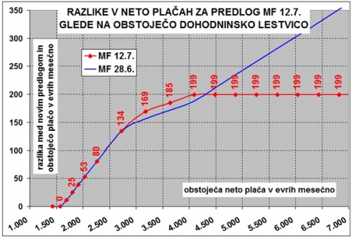 Predvidene spremembe dohodninske lestvice mogoče še najlepše prikazuje spodnja slika, kjer vidimo koliko višji bodo drugo leto naši prejemki glede na trenutno višino mesečne neto plače. Razlike se bodo pričele pri plači okoli 1.600 evrov mesečno, 50 evrov več na mesec bomo dobili, če danes zaslužimo 2.000 evrov neto, prejemniki plač nad 4.000 evrov neto pa bodo deležni 200 evrov višjih mesečnih prejemkov. Na sliki je prikazana še varianta Ministrstva za finance s konca junija, ko so še načrtovali tudi znižanje najvišje 50-odstotne dohodninske stopnje na 47 odstotkov (tega sedaj ne predlagajo več). V aktualnem predlogu so raje nekoliko izboljšali položaj prejemnikov plač med tri in štiri tisoč evrov neto in limitirali ugodnosti na 199 evrov mesečno (po verziji MF iz 28. junija bi nekaj sto prejemnikov najvišjih dohodkov v Sloveniji mesečno prejeli dodatno 500 ali tudi več evrov).