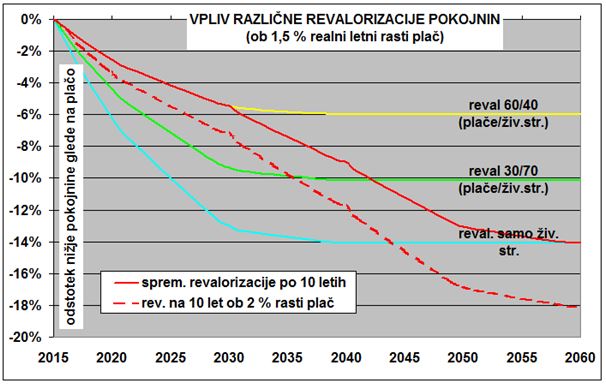 - kot eden ključnih elementov višine pokojninskih izdatkov in finančne vzdržnosti se kaže predlog postopne ukinitve usklajevanja pokojnin z rastjo plač, ker bi pomenilo dejansko še 15 % nižje pokojnine kot jih omogoča današnji sistem,