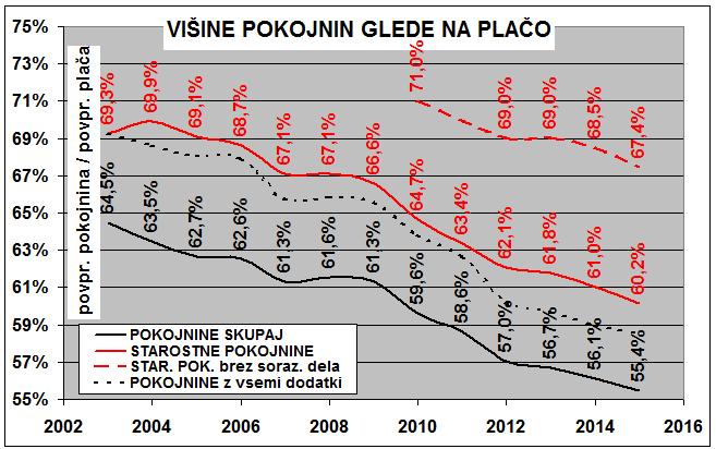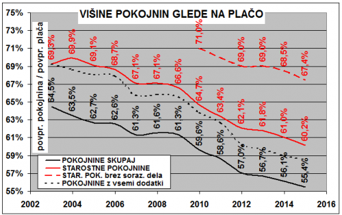 [1] Zanimiv pa je pogled še bolj nazaj, ko je bilo to razmerje tudi dokaj neugodno za takratne upokojence, saj se je v sedemdesetih in osemdesetih letih prav tako gibalo le na okoli 55 % neto plače. Do izboljšanja položaja upokojencev je nato prišlo zaradi masovnega upokojevanja po letu 1990, pri čemer so novi upokojenci na začetku prejemali kar okoli 80 % zadnje plače, medtem ko so bili v bivši Jugoslaviji odmerni odstotki nižji, pa tudi usklajevanje pokojnin je verjetno v manjši meri sledilo rasti plač.