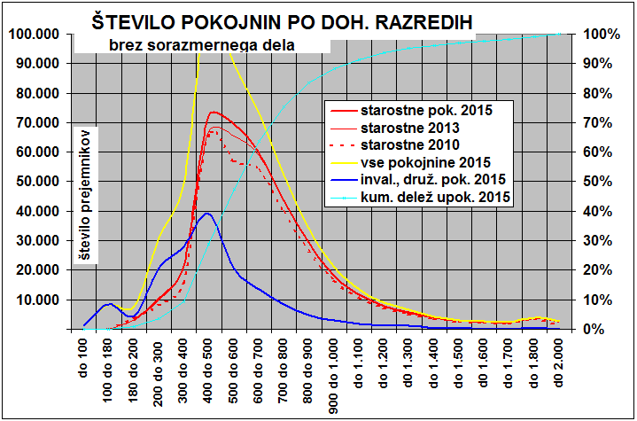 Pred navedbo razlogov za zaostajanje pokojnin za plačami dodajmo še prikaz distribucije izplačanih pokojnin v zadnjih letih in to brez prejemnikov sorazmernih pokojnin (tistih, ki prejemajo samo del pokojnine). Največ upokojencev prejema pokojnino med 400 in 500 evri, polovica vseh manj kot 600 evrov in le dobrih 10 % jih prejema več kot 1.000 evrov na mesec. Mogoče še podatek, da je lani blizu tri tisoč upokojencev prejemalo na mesec več kot 1.800 evrov bruto.