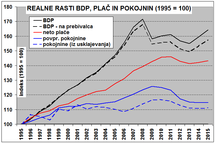 Najhitreje je seveda rastel bruto domači proizvod Slovenije (BDP) in sicer po povprečni stopnji 2,5 % letno, do nastopa krize celo po 4 odstotke na leto in šele naslednje leto bomo ponovno dosegli nivo iz leta 2008[2]. Neto realne plače so rasle počasneje in sicer 1,8 % povprečno na leto z manjšim vplivom krize oz. do manjšega upada je prišlo samo v letih 2012 in 2013. Še skromnejša pa je bila realna rast povprečne pokojnine in sicer le 0,7 % povprečno na leto. Do nastopa krize sicer nekaj več (1,6 %) nato pa je prišlo do precejšnjega realnega nazadovanja, skupaj skoraj za desetino. Zaradi te, skoraj 20 odstotkov počasnejše realne rasti pokojnin glede na plače, se je tudi poslabšalo razmerje med plačami in pokojninami iz nekdanjih 70 na 55 %.