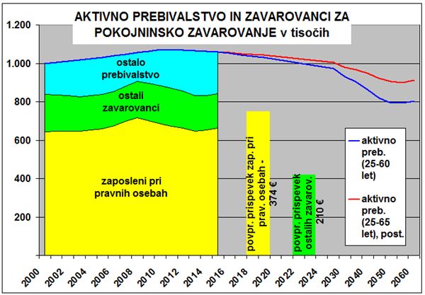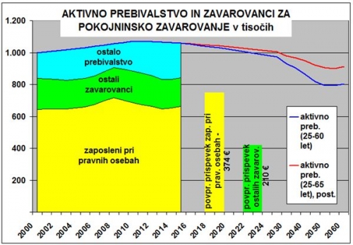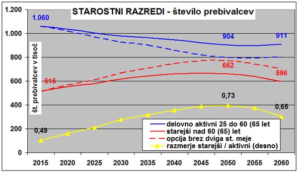 Gibanja števila prebivalcev v obeh skupinah so prikazana s polno črto, prekinjeni črti pa prikazujeta opcijo, če ne bi prišlo do dviga starostne meje za upokojevanje na 65 let in bi ostali pri obstoječi zakonodaji in pogojih upokojevanja tudi naslednjih 50 let (kar seveda vsi vemo, da ni sprejemljivo).