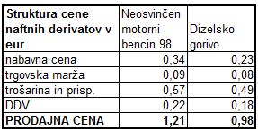Za začetek je v spodnji tabeli prikazana struktura cen naftnih derivatov za dve najbolj prodajani vrsti goriv (za obdobje 2.2.-15.2.2016). Trenutna cena goriv je zelo nizka, tako da največji del cen predstavlja trošarina skupaj še z nekaterimi drugimi prispevki (za CO2, za el. energijo), na vse skupaj pa še 22 % DDV. Trgovska marža je v končni ceni okoli 7 %, čeprav v prodajni ceni pred dajatvami vseeno znaša tudi četrtino (pri dizlu). V prvi analizi so avtorji ocenili, da bi se ob sprostitvi cen marža dvignila za kake tri cente in ta sprememba večjega vpliva na končno ceno niti nima. Marže so namreč v Sloveniji glede na druge države najnižje in zato je realno pričakovati njihov dvig. Končna cena goriv je v Sloveniji višja kot npr. v Avstriji zaradi višjih davščin, medtem ko je prodajna cena brez dajatev pri nas nižja.
